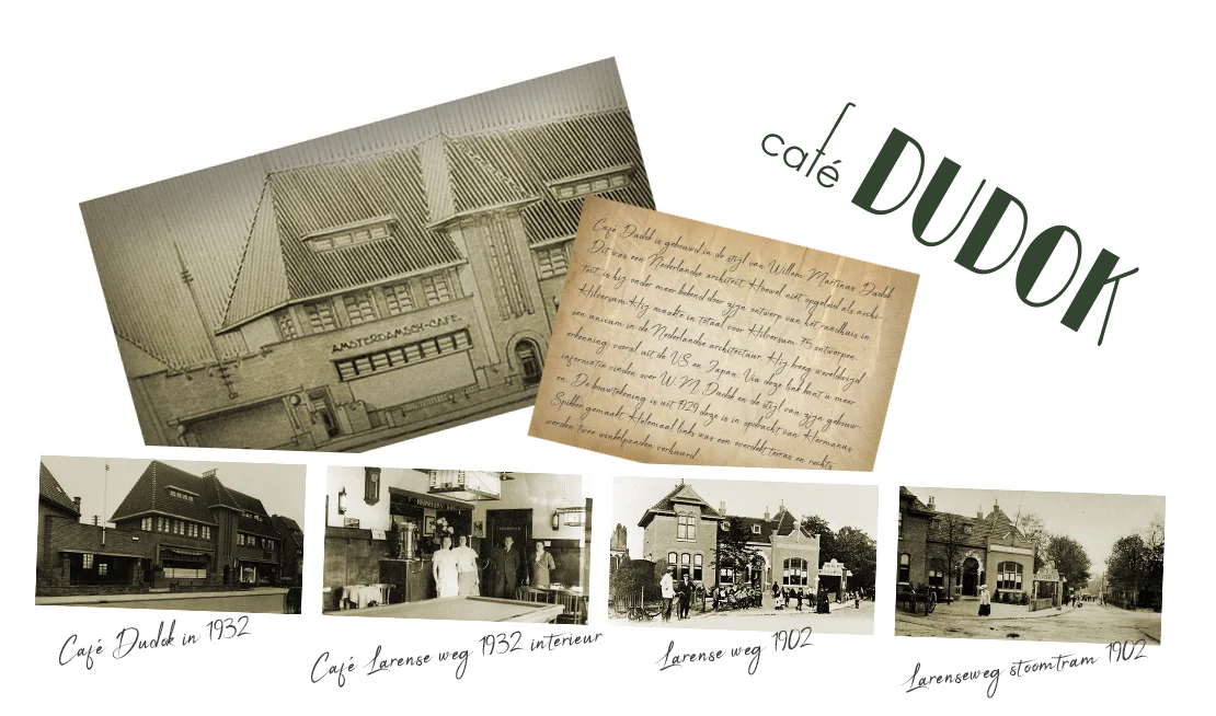 Café Dudok is gebouwd in de stijl van Willem Martinus Dudok. Dit was een Nederlandse architect. Hoewel niet opgeleid als architect, is hij onder meer bekend door zijn ontwerp van het raadhuis in Hilversum.Hij maakte in totaal voor Hilversum 75 ontwerpen, een unicum in de Nederlandse architectuur. Hij kreeg wereldwijd erkenning, vooral uit de VS en Japan. Via deze link kunt u meer informatie vinden over W. M. Dudok en de stijl van zijn gebouwen. De bouwtekening is uit 1929 deze is in opdracht van Hermanus Spikker gemaakt. Helemaal links was een overdekt terras en rechts werden twee winkelpanden verhuurd.